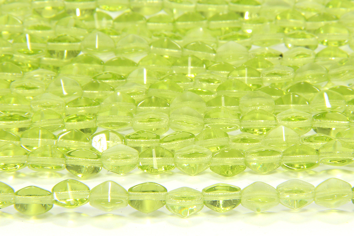 A 38 bead strand of high quality Czech pressed glass Spring Green Lustre Pinch Beads. With 3 flat surfaces to catch the light that are tapered at each end to give a barrel like appearance, these beautiful beads are perfect G8 adding some interesting texture to your designs in an understated way. Lustred transparent glass