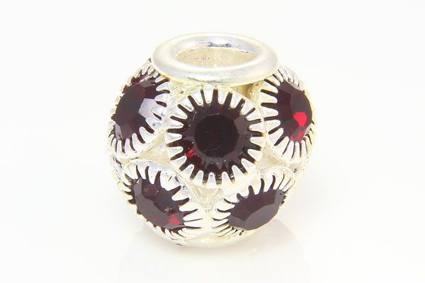 A beautiful Pandora Style Garnett Cubic Zirconia crystal studded bead with a 4mm hole. The patterned silver plated base has 5mm crystals that give a brilliant sparkle, perfect for both day and night. They make an excellent focal point for your jewellery.