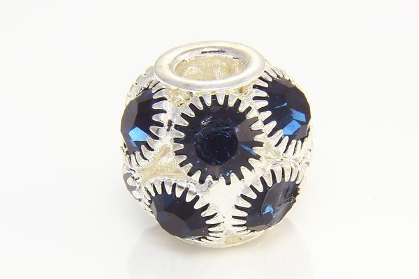 A beautiful Pandora Style Midnight Blue Cubic Zirconia crystal studded bead with a 4mm hole. The patterned silver plated base has 5mm crystals that give a brilliant sparkle, perfect for both day and night. They make an excellent focal point for your jewellery.