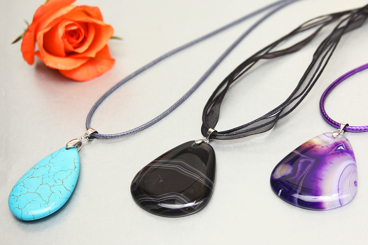 The set includes one Turquoise Howlite pendant, one black banded agate and one purple banded agate pendant. You also get a silk neckcord to match each pendant too!