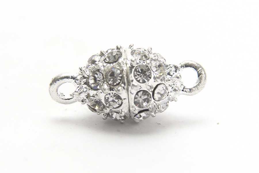 This 14x10mm sized clasp is plated with Crystal Studded Bright Silver. It has a Oval shape and has a Magnetic closure. There is 1 Piece per pack.