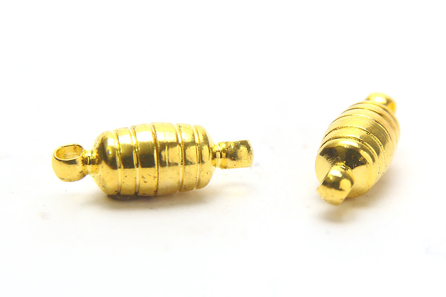 This 15x6mm sized clasp is plated with Gold. It has a Patterned shape and has a Magnetic Cylinder closure. There is 2 Pieces per pack.