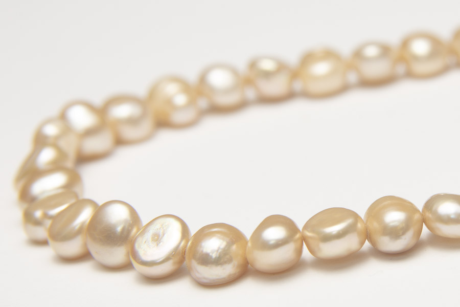 A 16 inch strand of high quality Champagne Nugget Freshwater Pearls. Each naturally formed bead is between 7mm and 8mm and centre drilled through the middle of the pearl. These beautiful champagne pearls have a beautiful diffuse lustre that looks radiant against the skin.