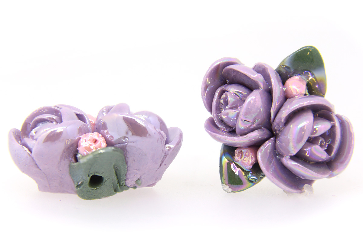 15x30mm, 2 Large Glazed Lilac Roses, 1 Ceramic Bead, 2mm Hole