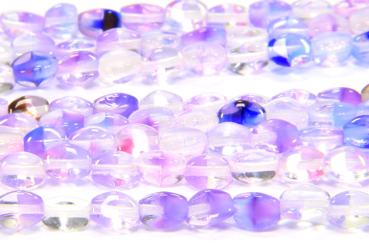 A 38 bead strand of high quality Czech pressed glass Orchid Mix Pinch Beads. With 3 flat surfaces to catch the light that are tapered at each end to give a barrel like appearance, these beautiful beads are perfect G8 adding some interesting texture to your designs in an understated way. lustre coated transparent glass