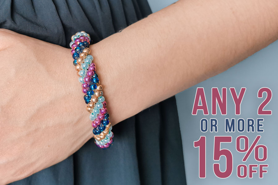 Get any 2 or more kits (even 2 of the same) and receive bonus pattern add ons for making a 4 colour stripe and also instructions to convert your kit into a necklace!
