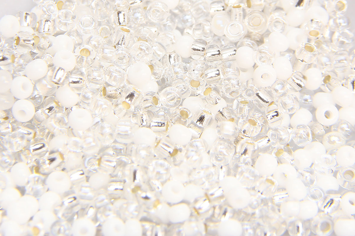 A mix of white, clear and silver lined, Czech size 10 Preciosa seed beads, 25g resealable bag.