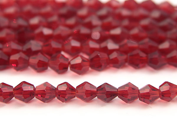 6mm Ruby Red Crystal Bicones, 12″ strand, approx 50 beads