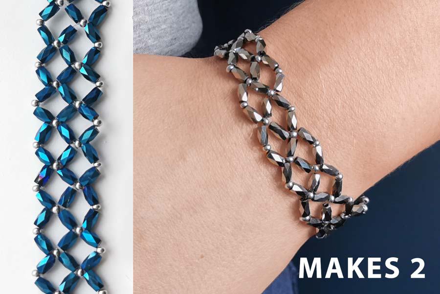 Each kit features a beautiful combination of 2 different crystal bugle beads woven into a delicate netted bracelet that’s as light as air. This minimalist piece is perfect for layering or wearing alone and can be made into single block colours or multi-coloured.