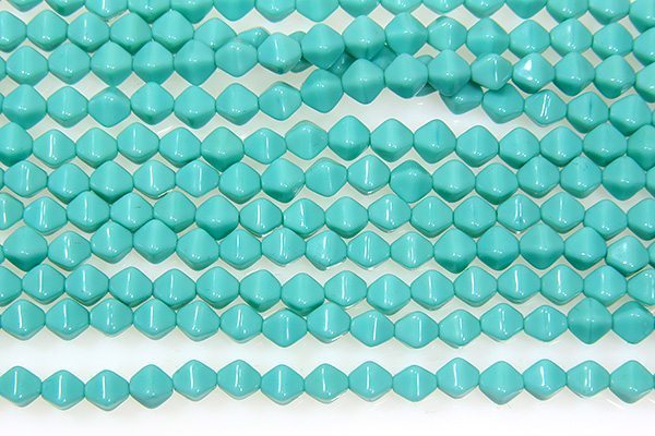 A 25 bead strand of 6mm Opaque Turquoise Bi-cones. The interesting shape of these beads allows you to use them creatively while adding texture and intrigue to your designs.