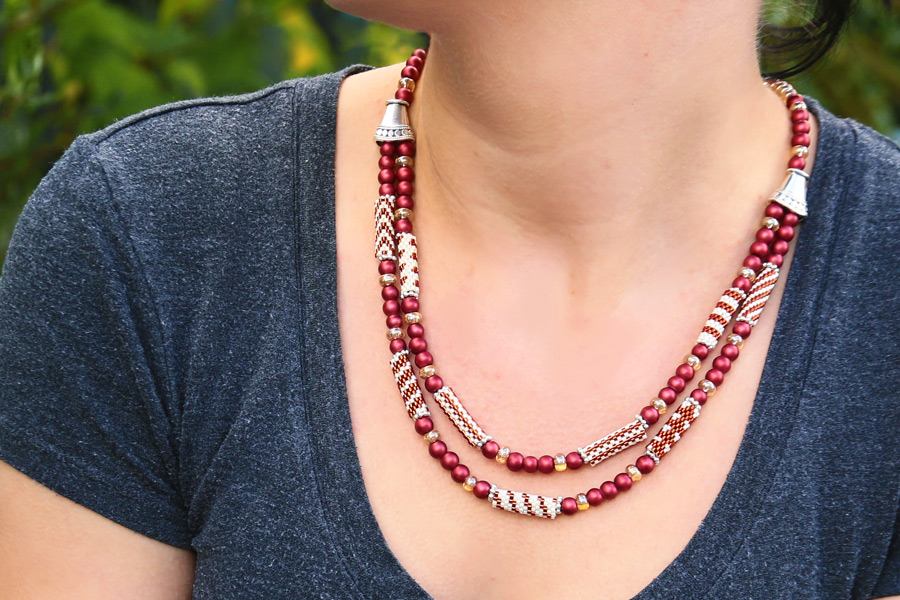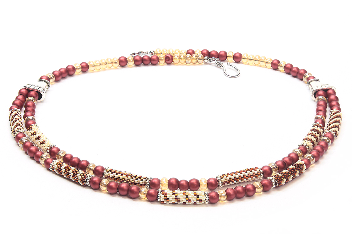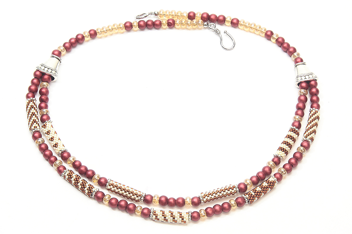 Sienna Florentine Carrier Tube Necklace includes two colours of precision made Miyuki Delica beads with an inner tubing. Included are 5 easy but effective looking carrier tube patterns with both picture chart and matching word chart.