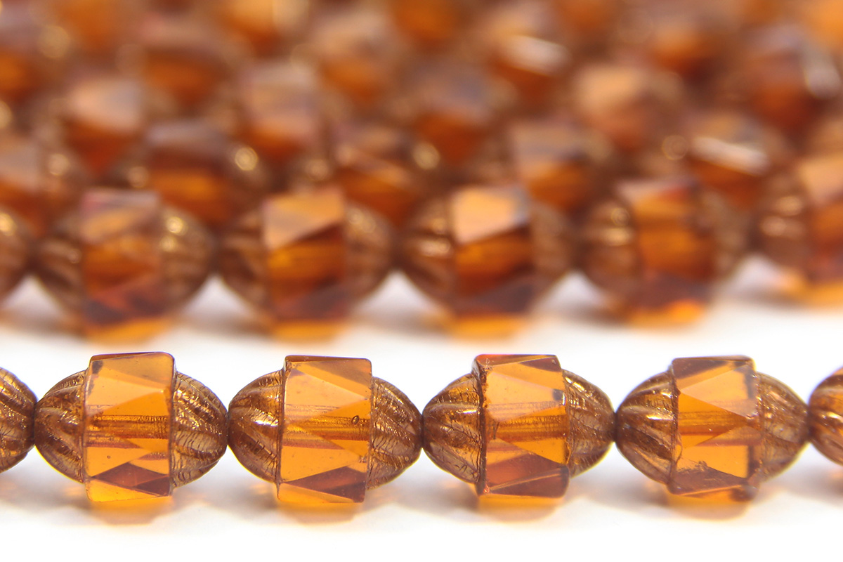 10x8mm Dark Amber Firepolish, Bronze Crowned Czech Bols, 6 beads