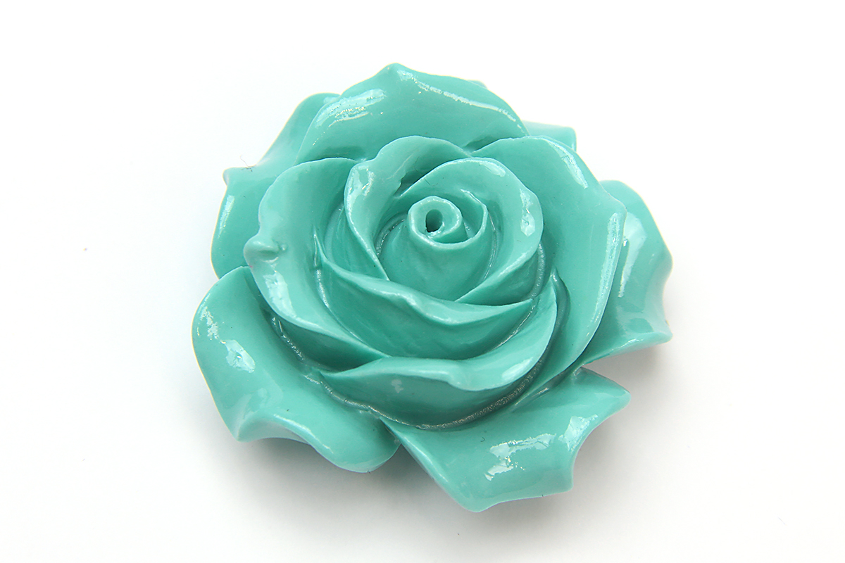 Each of these 35mm Turquoise Open Rose beads are molded from an alabaster and shell composite then individually hand finished to have pristine edges and details. The Alabaster provides each bead with both durability and a luxurious feel with the shell providing a lusterous appearance and slight translucence as though each gemstone flower has its own gentle inner glow. Each packet contains 1 bead.