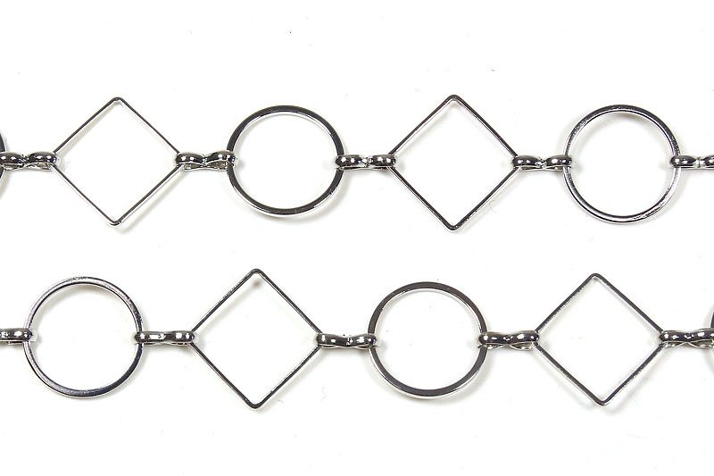 High quality silver plated brass chain. 1m long. Linked diamonds and circles.