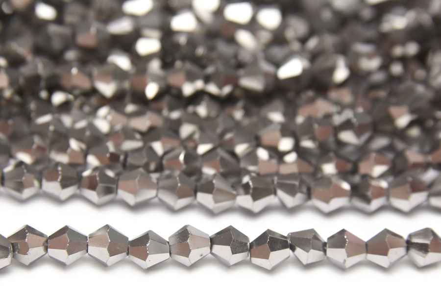6mm Metallic Silver Coated Crystal Bicones, 12″ strand, approx 50 beads