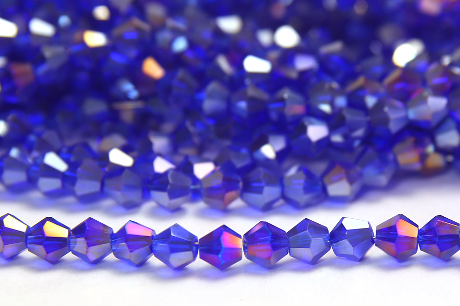 6mm Royal Blue AB Coated Crystal Bicones, 12″ strand, approx 50 beads