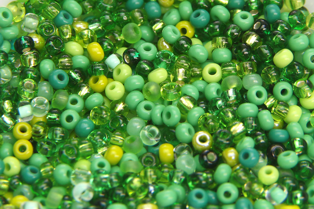 A mix of transparent, opaque and silver lined greens, Czech size 10 Preciosa seed beads, 25g resealable bag.