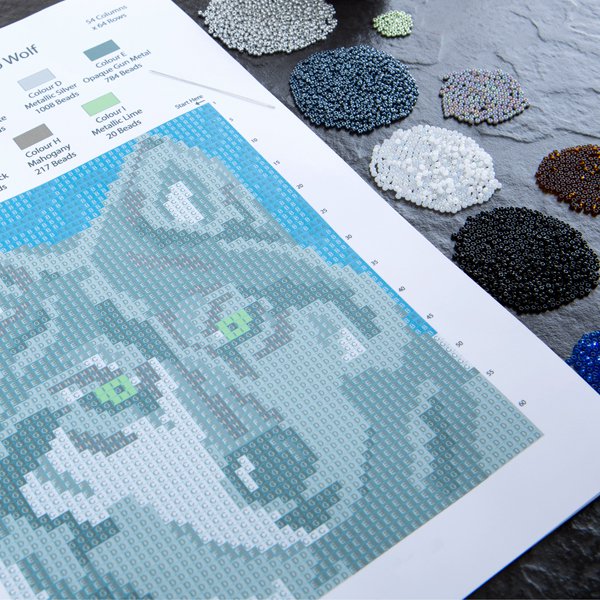 A beautiful Arazzo Wolf kit, including all beads, Arazzo Backing Fabric, a needle, thread and instructions.