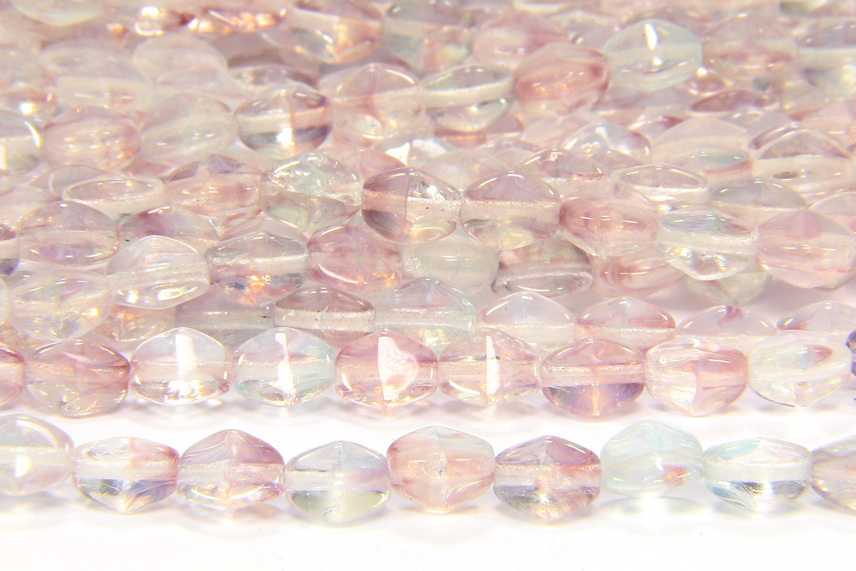 A 38 bead strand of high quality Czech pressed glass Lustre Thistle Pinch Beads. With 3 flat surfaces to catch the light that are tapered at each end to give a barrel like appearance, these beautiful beads are perfect G8 adding some interesting texture to your designs in an understated way. lustre coated transparent glass