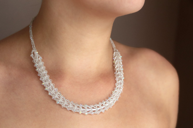 The stunning Sparkling Crystal Entice necklace is made with premium quality 3x7mm Crystal Bricks, adorned by facetted crystals and illuminated with beautifully colour matched Preciosa seed beads. The finished design drapes so comfortably and yet remains absolutely enticing.