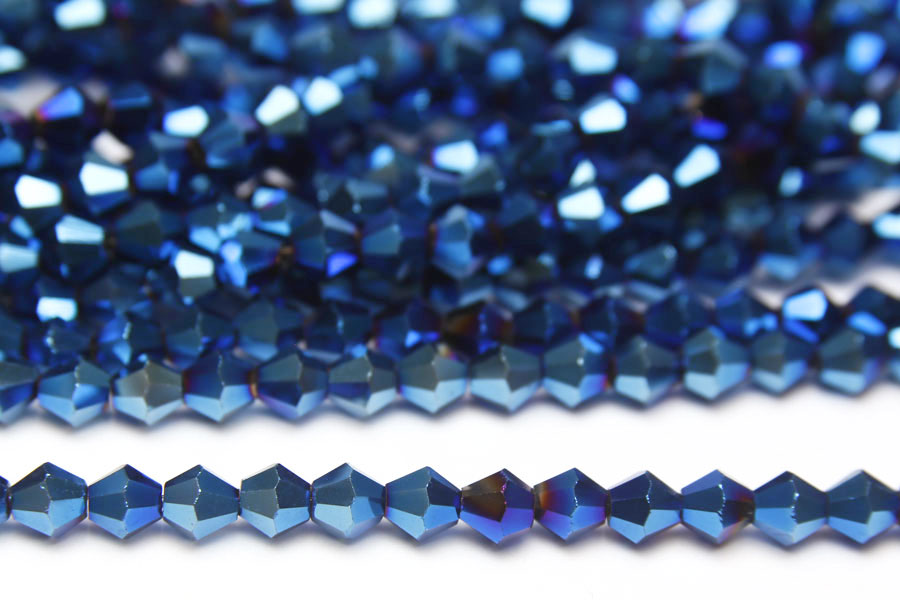 6mm Metallic Electric Blue Coated Crystal Bicones, 12″ strand, approx 50 beads