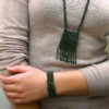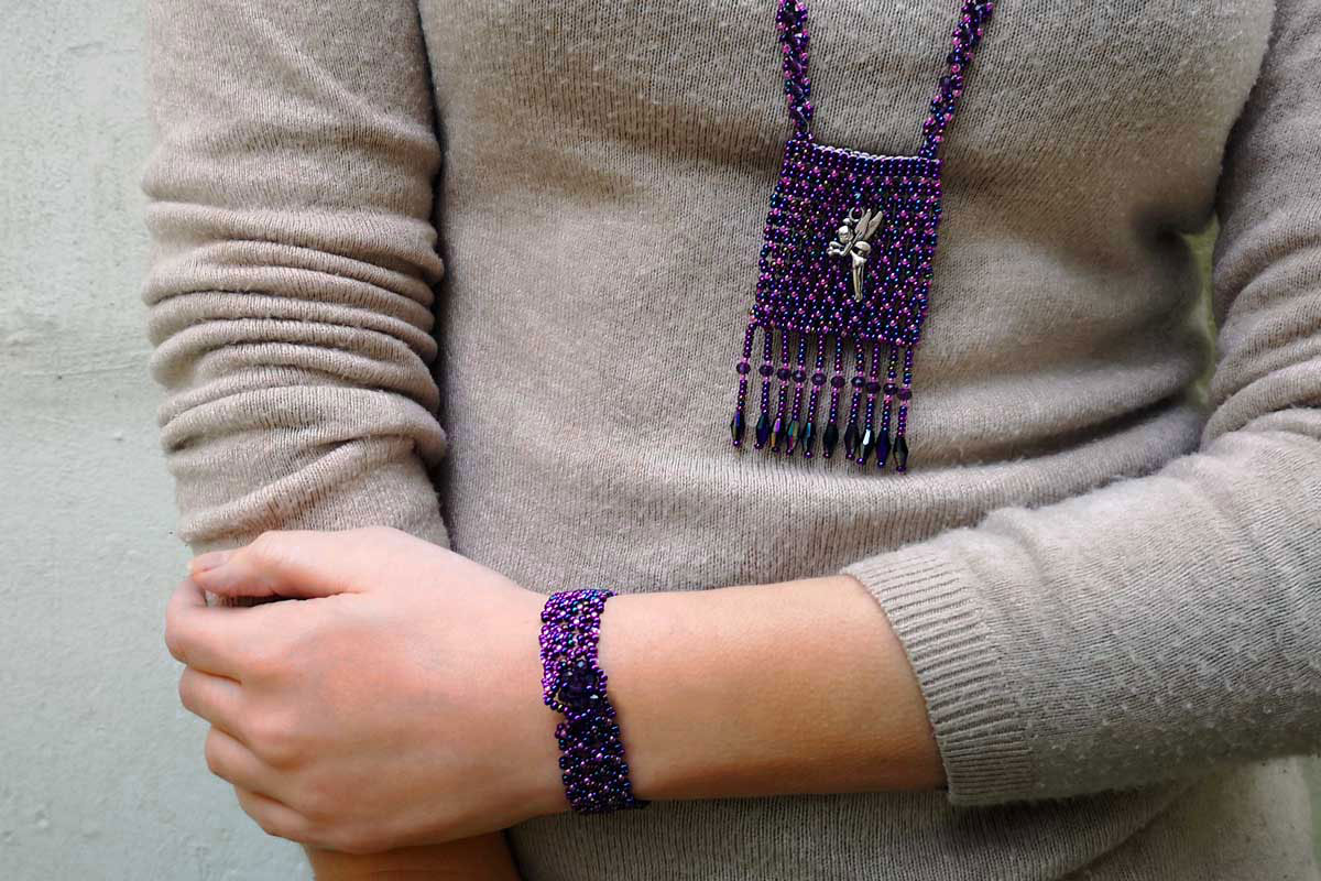 This unique design is perfect for holding anything small and dear to you, things you want to have with you while wearing it. The pattern can also be expanded upon to create any larger bag as well. It’s the exact same technique! This stylish and useful necklace and bracelet set will add a great focal point for both your day or night time outfits.