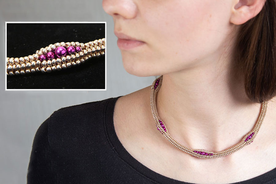 This gorgeous Herringbone stitch necklace is enhanced by a spectacular hematite colour pop!