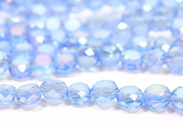French Blue AB 6mm coins with a frosted top and bottom surface and highly facetted edges. 8 inch Strand