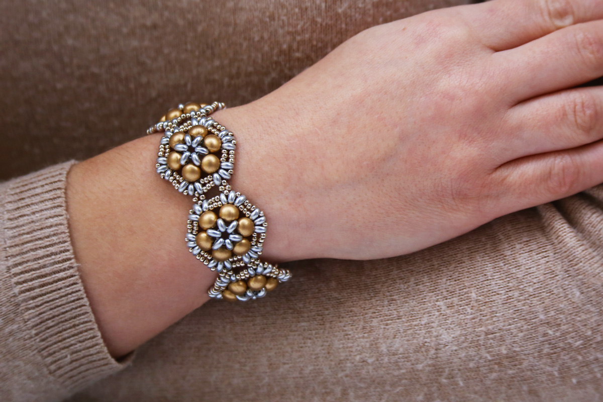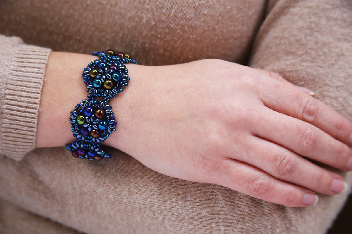 The Brocade Bracelet is absolutely sumptuous. Designed by Helena Chmelikova, it incorporates a variety Preciosa beads. The complimentary effect created is simply gorgeous. It is a must have design for 2020.