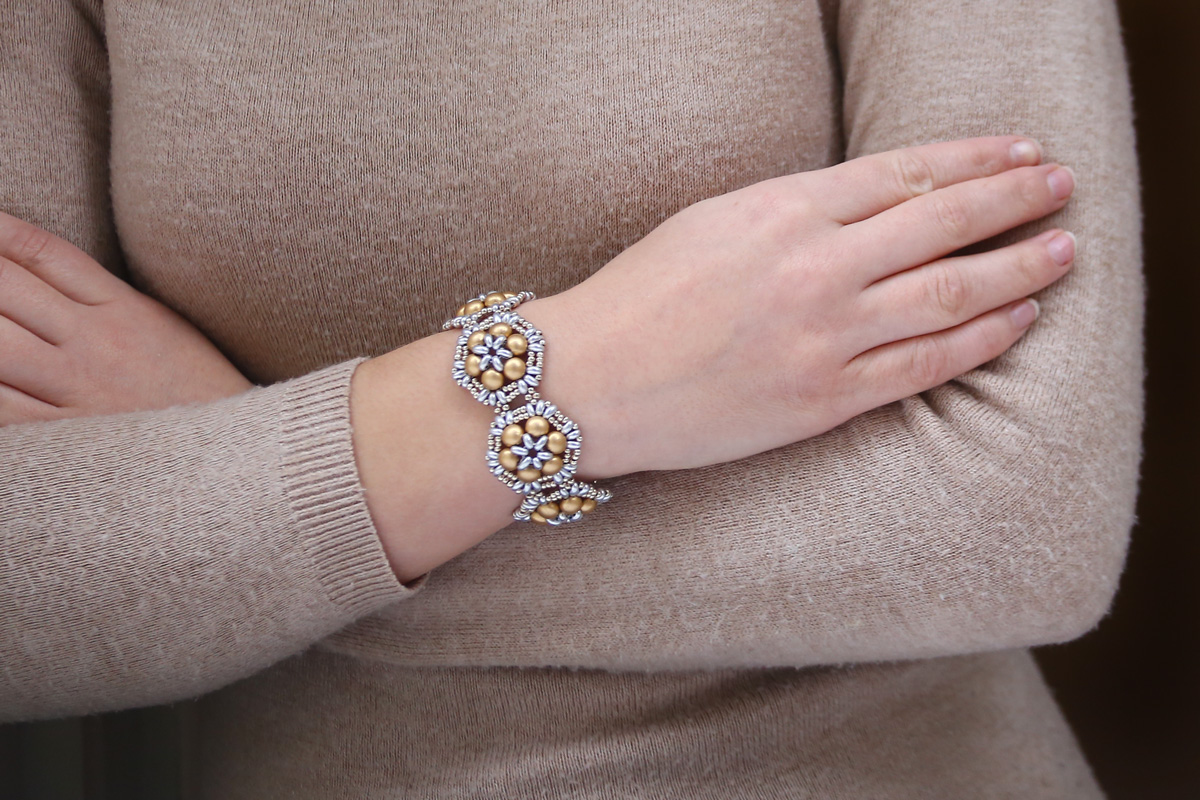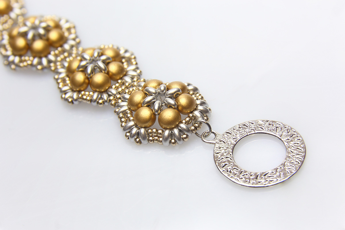 The Silver Gold Brocade Bracelet is absolutely sumptuous. Designed by Helena Chmelikova, it incorporates a variety Preciosa beads. The complimentary effect created is simply gorgeous. It is a must have design for 2019.