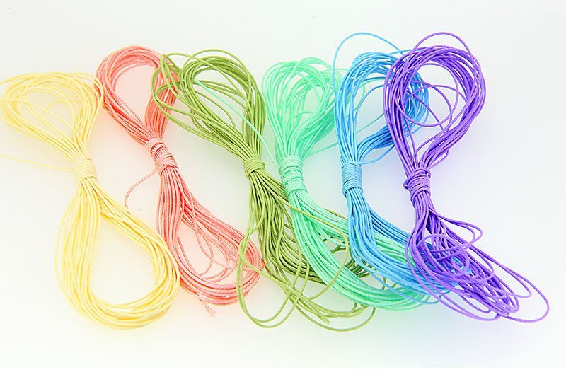 6 Colours, 0.5mm Woven man-made silk on polyester core cord, 5m per colour.