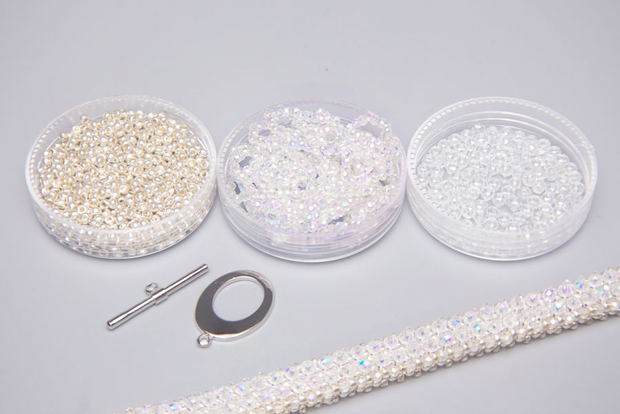 A gorgeous cubic right angle weave bracelet adorned with our exclusive Aurora Micro Crystals. Our elegant beaded bracelet is a fun and easy bracelet to make and wear, great for any occasion. Made using Preciosa Seed Beads, 2 x2.5mm Crystal Donuts and Aurora Micro Crystals, our Elizabeth bracelet catches the light beautifully. Each kit makes one beaded bracelet and includes everything you need to get started. This bracelet is a good way to get familiar with cubic right angle weave and is great for intermediate and advance beaders alike.