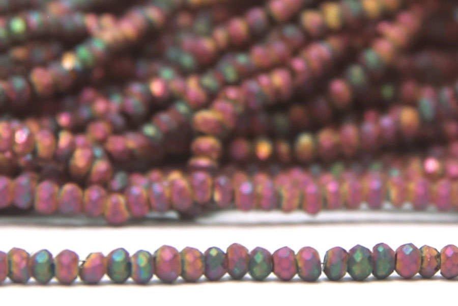 Size 11/0 Satin Metallic Magenta Rose Aurora MicroCrystal beads. Made at 1.5mm x 2.0mm to match the size of Toho 10/0, Miyuki 11/0 or Preciosa 10/0 seed beads perfectly. Made from high quality facetted crystal glass in packs of approximately 200 beads.