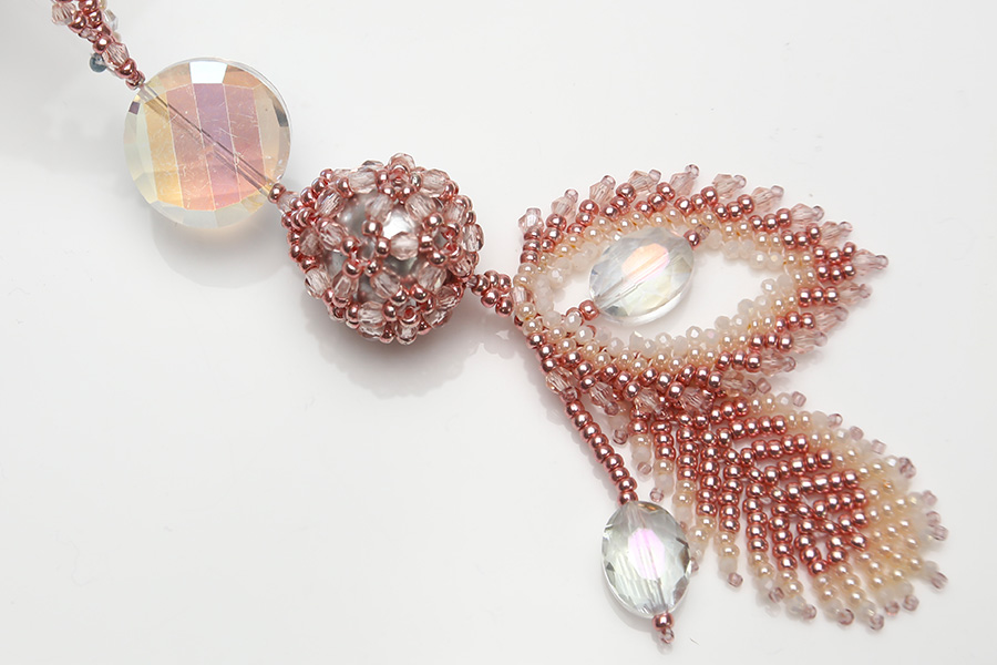 The tassel section features stunning beaded feather and leaf charms, adorned with a selection of unique crystals and all draped from a beaded focal drop and gorgeous double helix beaded chain.