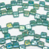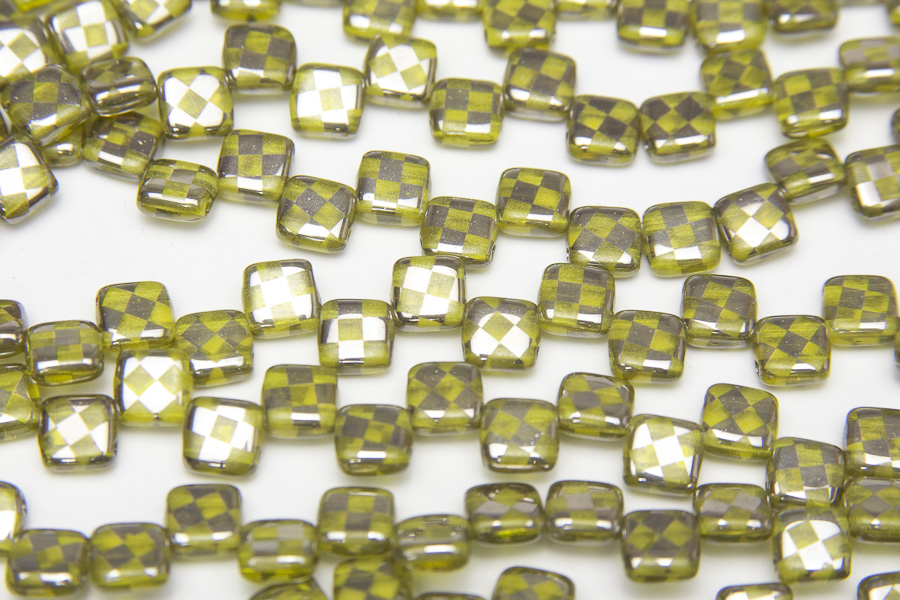 A 33 bead strand of Olivine Checker Stenciled 2-Hole Tiles made from the highest quality pressed Czech Glass. With 2 holes passing through each one, these beads are excellent for multistranded jewellery and bead weaving designs.