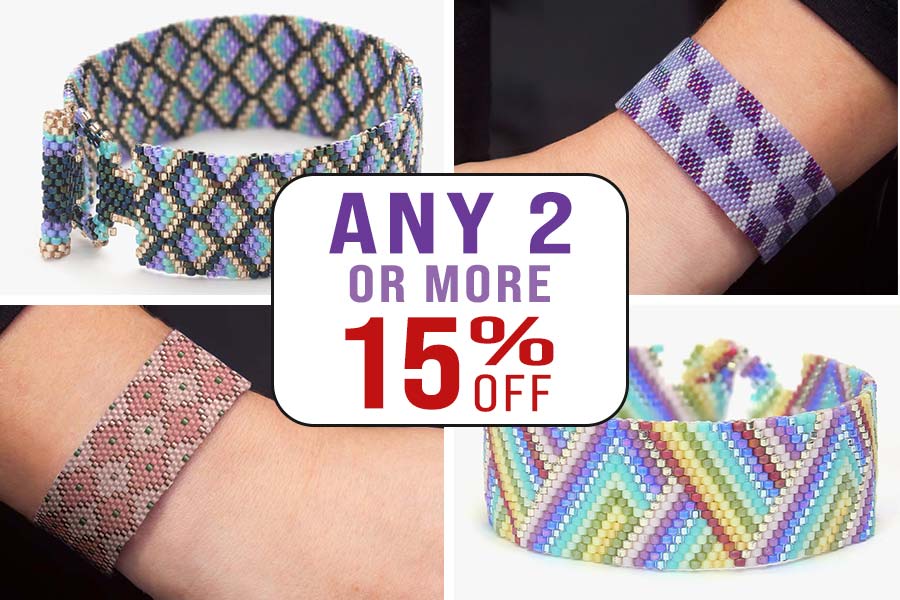 Get any 2 or more beautiful geometric patterned bracelets for a fantastic 15% off discount! They are great jewellery making kits for beginners or those looking to improve their odd or even count peyote skills. Each bracelet kit uses beautiful matching colours of size 11/0 Miyuki Delica Beads.