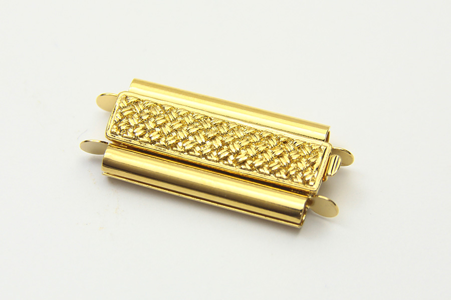 An elegant cross hatch design gold plated Beadslide clasp. 10x24mm. Slide the end of you bracelet into the tube clasp and bend the sides with pliers to close. A perfect professional clasp for your woven seed bead or bead loom project. Quick, easy and elegant.
