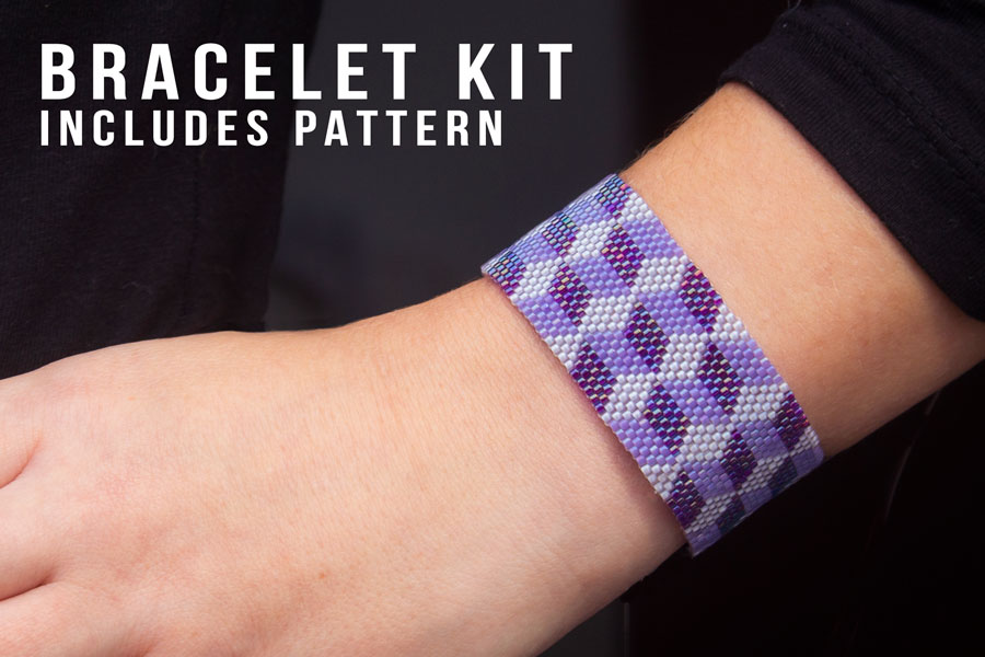 This beautiful geometric patterned bracelet is a great jewellery making kit for beginners or those looking to learn or improve their even count peyote skills. This bracelet kit uses 3 beautiful colours of size 11/0 Miyuki Delica Beads to create a multicolour tumbling block patterned bracelet.