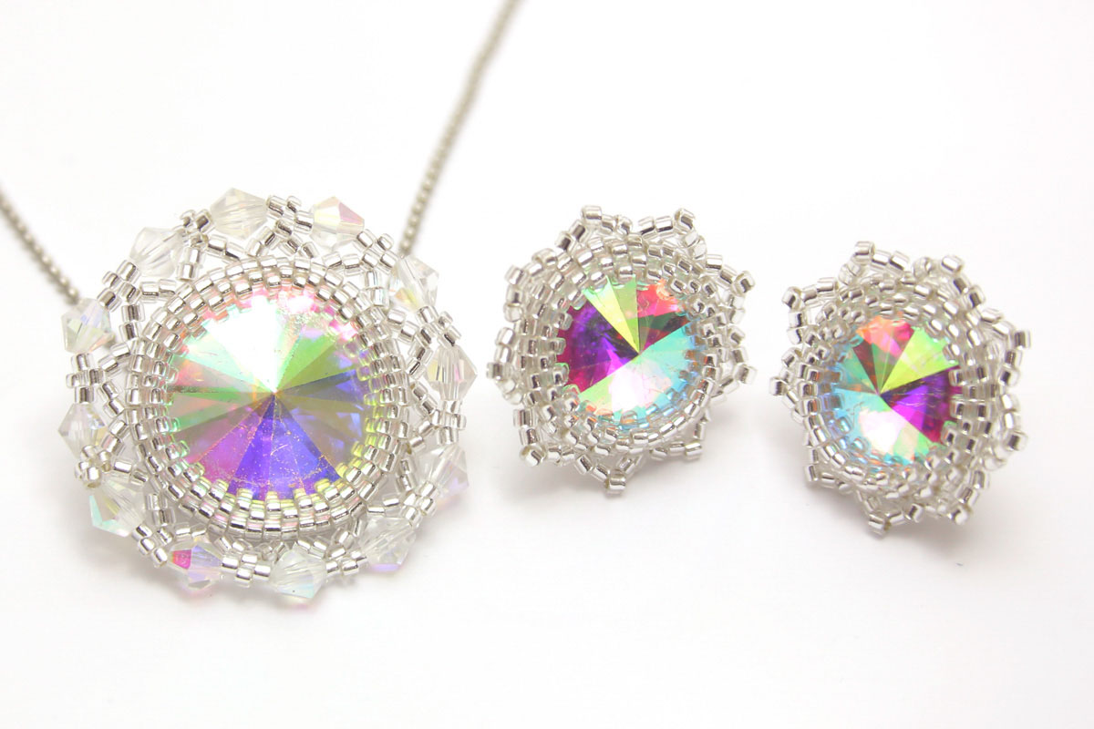 Make your jewellery with Mathew! Watch the live tutorial showing you how to make your very own pendant and and earrings using rivolis, seed beads and delica beads.