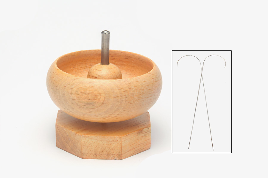 Fill the bowl about half-full of beads, insert a curved beading needle into the spinning beads and watch them jump onto the needle.