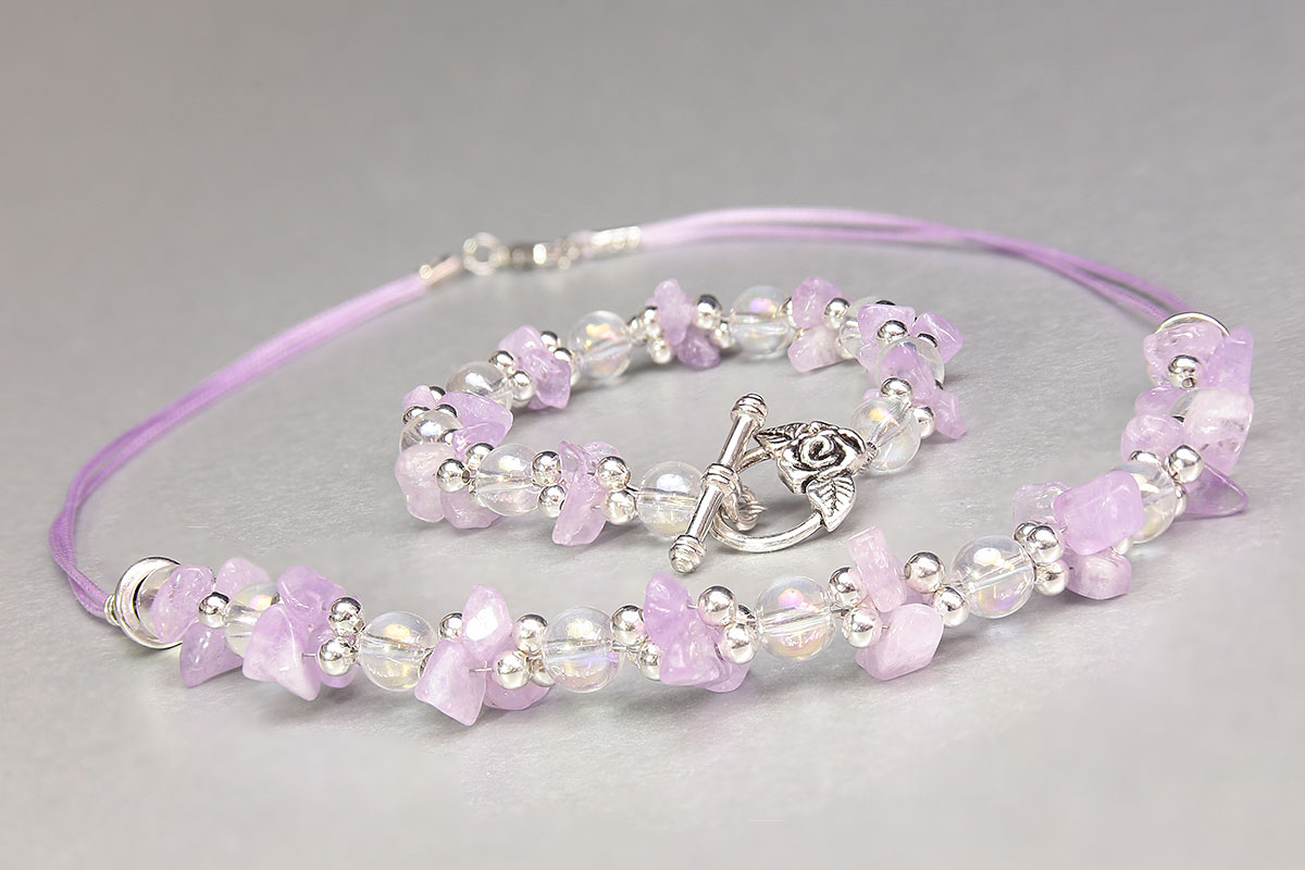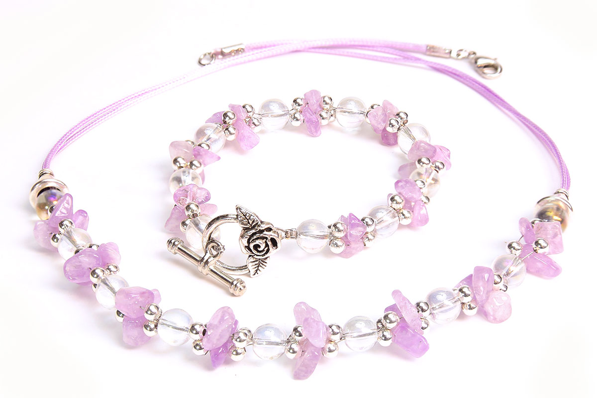 The Tranquility necklace and bracelet set is made with beautiful quality semi precious gemstones, clustered between perfectly colour matched 8mm Crystals and adorned with 4mm spacer beads. The finished design is light and luxurious, sitting extremely comfortably while still exuding quality.