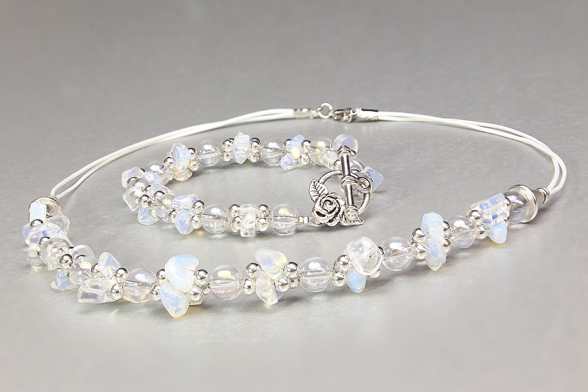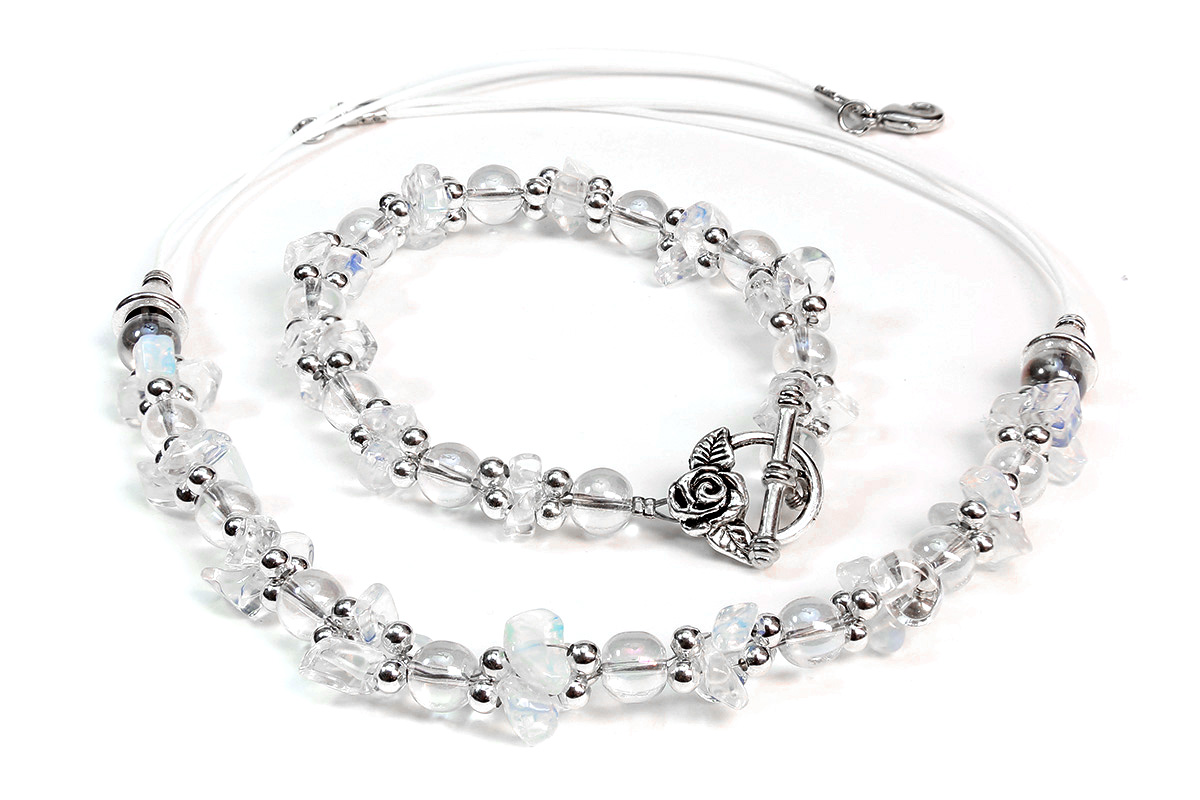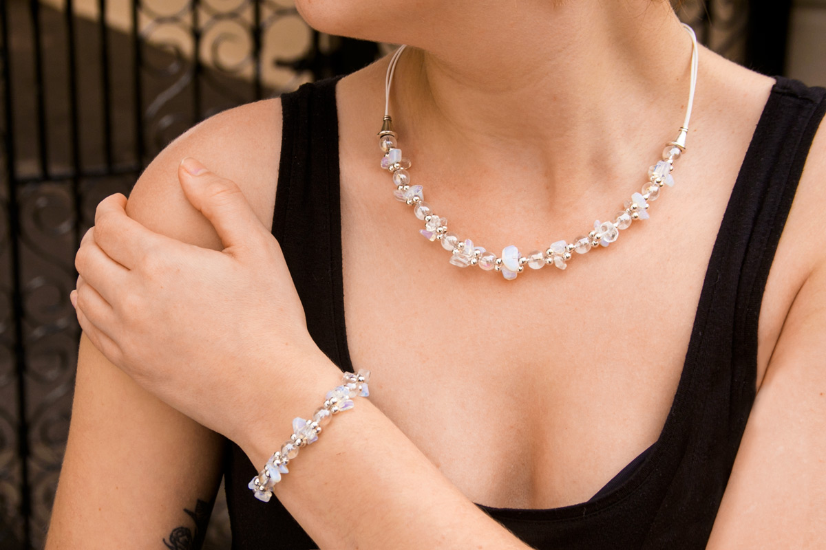 The Tranquility necklace and bracelet set is made with beautiful quality semi precious gemstones, clustered between perfectly colour matched 8mm Crystals and adorned with 4mm spacer beads. The finished design is light and luxurious, sitting extremely comfortably while still exuding quality.