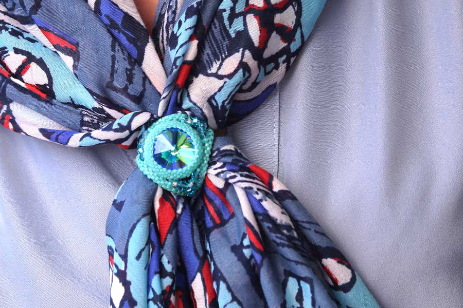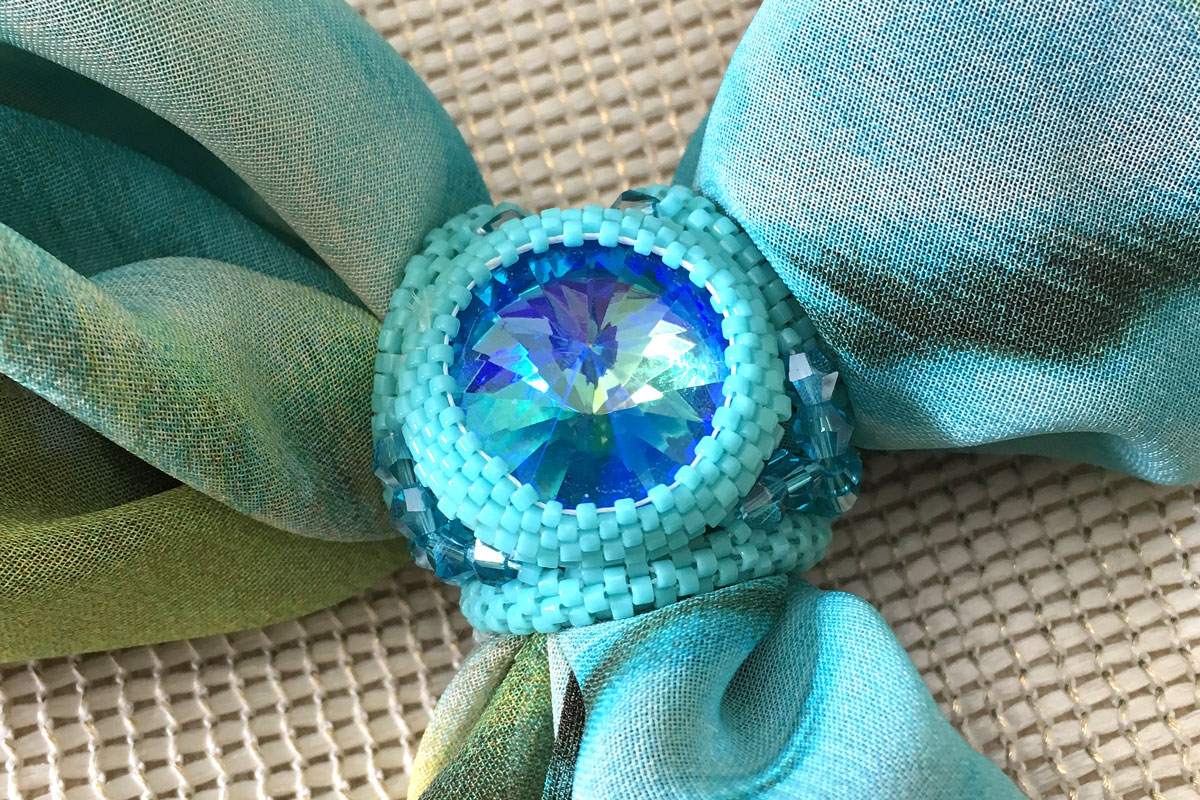 Enjoy the warm weather in style with the Sparkling Turquoise Crystal Scarf and Sarong Ring Accessory. Designed with an eye catching Aurora DuraCoat 20mm crystal rivoli as the centre piece and encased in beautifully matched Japanese Delicas and seed beads, this extremely versatile accessory is stunning.