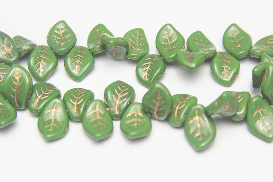 14x11mm Gold Veined Opaque Cactus Green Top Drilled Leaf made from high quality pressed Czech glass. Each bead is moulded to include a leaf stem structure for added texture. Coming in a pack of 18 beads, these gorgeous beads are perfect for floral designs or nature themed designs