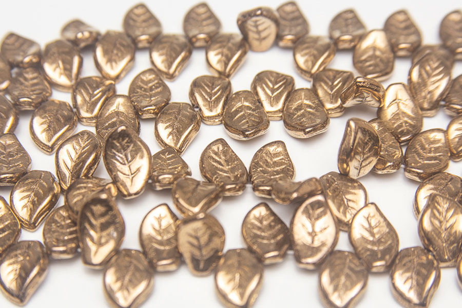 14x11mm Metallic Light Bronze Top Drilled Leaf made from high quality pressed Czech glass. Each bead is moulded to include a leaf stem structure for added texture. Coming in a pack of 18 beads, these gorgeous beads are perfect for floral designs or nature themed designs