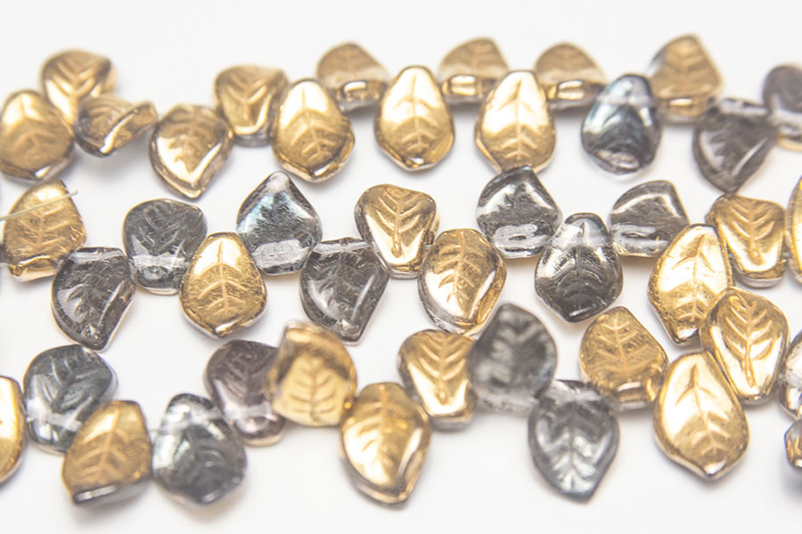 14x11mm Semi Metallic Gold Crystal Top Drilled Leaf made from high quality pressed Czech glass. Each bead is moulded to include a leaf stem structure for added texture. Coming in a pack of 18 beads, these gorgeous beads are perfect for floral designs or nature themed designs