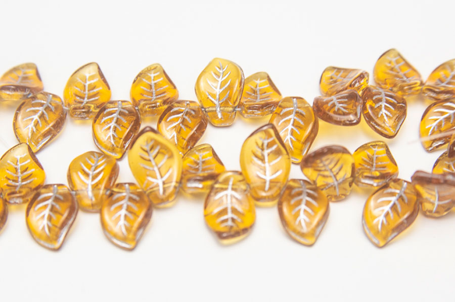 14x11mm Silver Veined Amber Top Drilled Leaf made from high quality pressed Czech glass. Each bead is moulded to include a leaf stem structure for added texture. Coming in a pack of 18 beads, these gorgeous beads are perfect for floral designs or nature themed designs