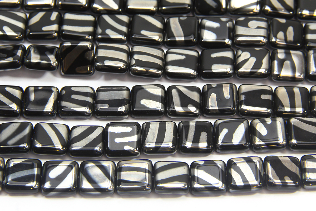 10mm Black Square with Silver Stripe Peacock Beads, 20 beads