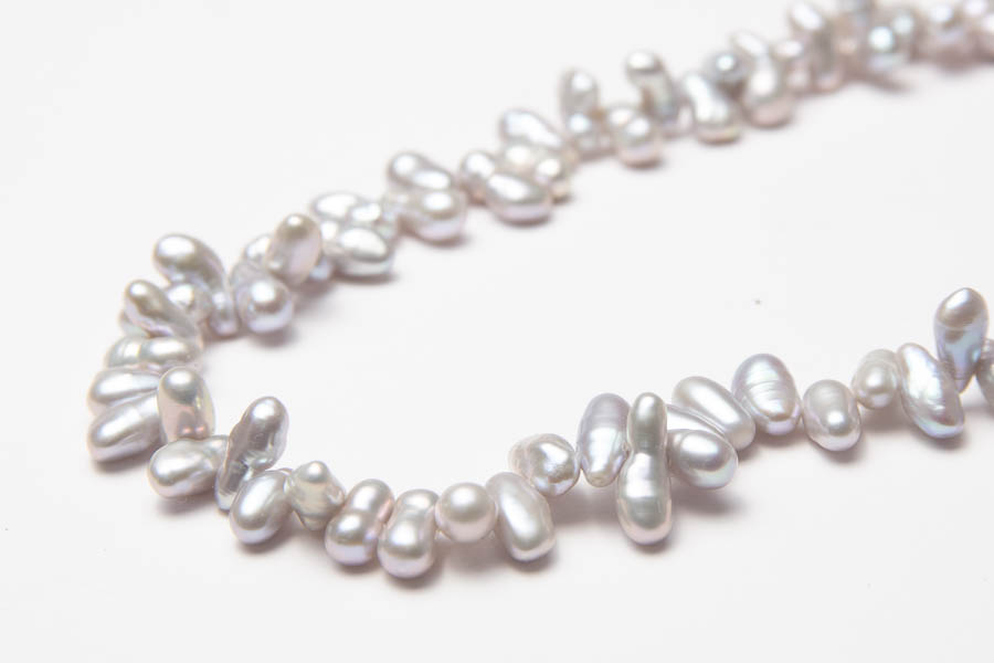 A 16 Inch Strand of High Quality 6x10mm Top Drilled Silver Peacock Keshi Freshwater Pearl Beads.