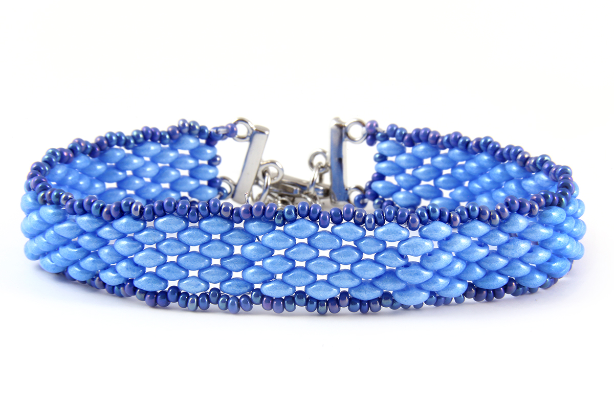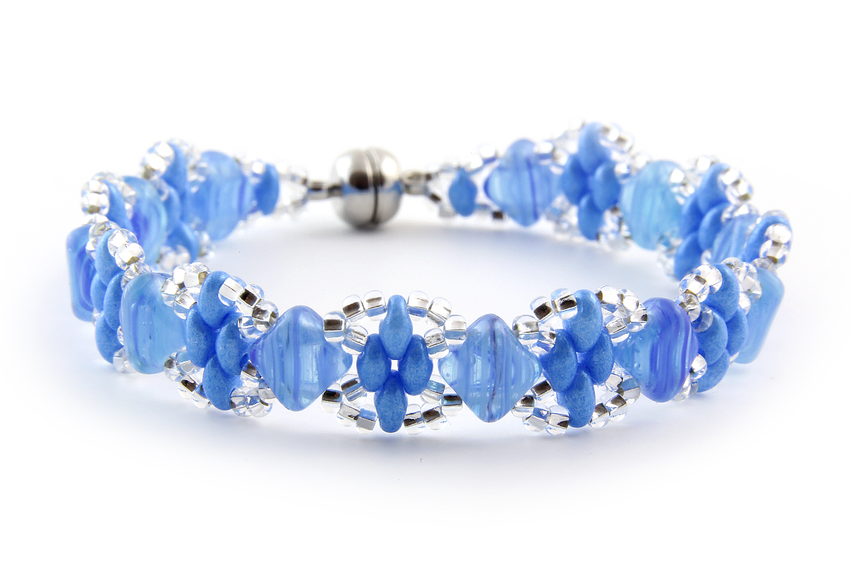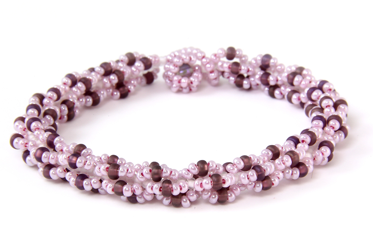There are two different variants to choose from; Azure and French Rose. Azure contains beads with cool blue shades, coordinating white jewellery thread and silver coloured seed beads. French Rose includes elegant shades of purples and pinks, with coordinating shades of clear aurora beads, white seed beads and clear dagger beads.